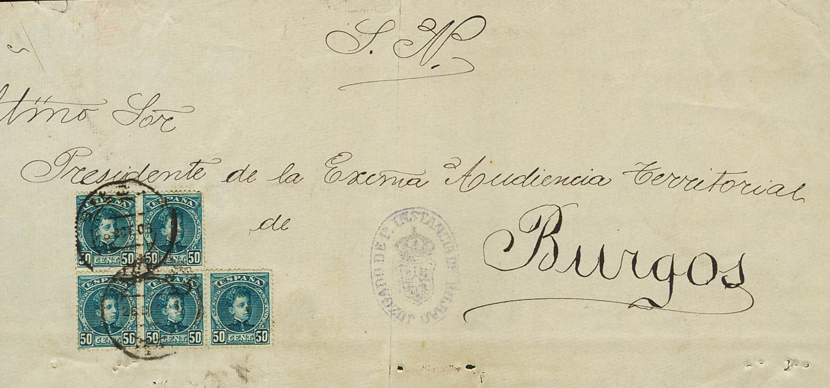 252(5). 1906. 50 greenish blue cts, five stamps. Judicial Escrow Front from BILBAO to BURGOS. MAGNIFICENT.