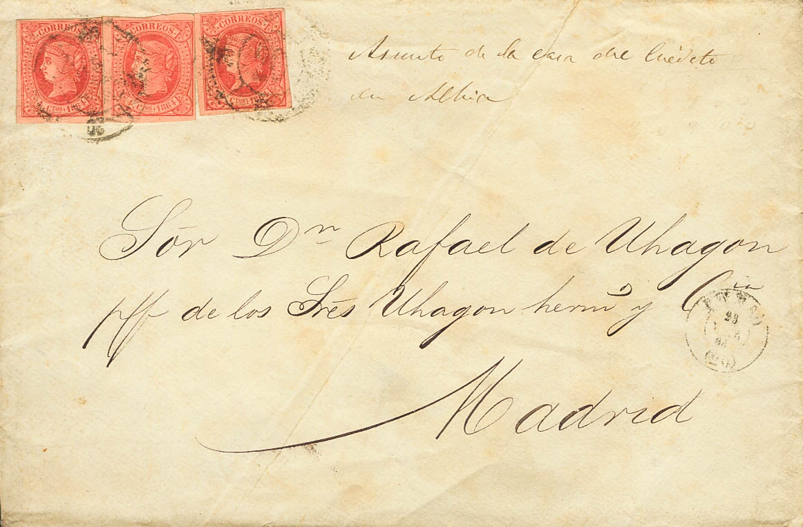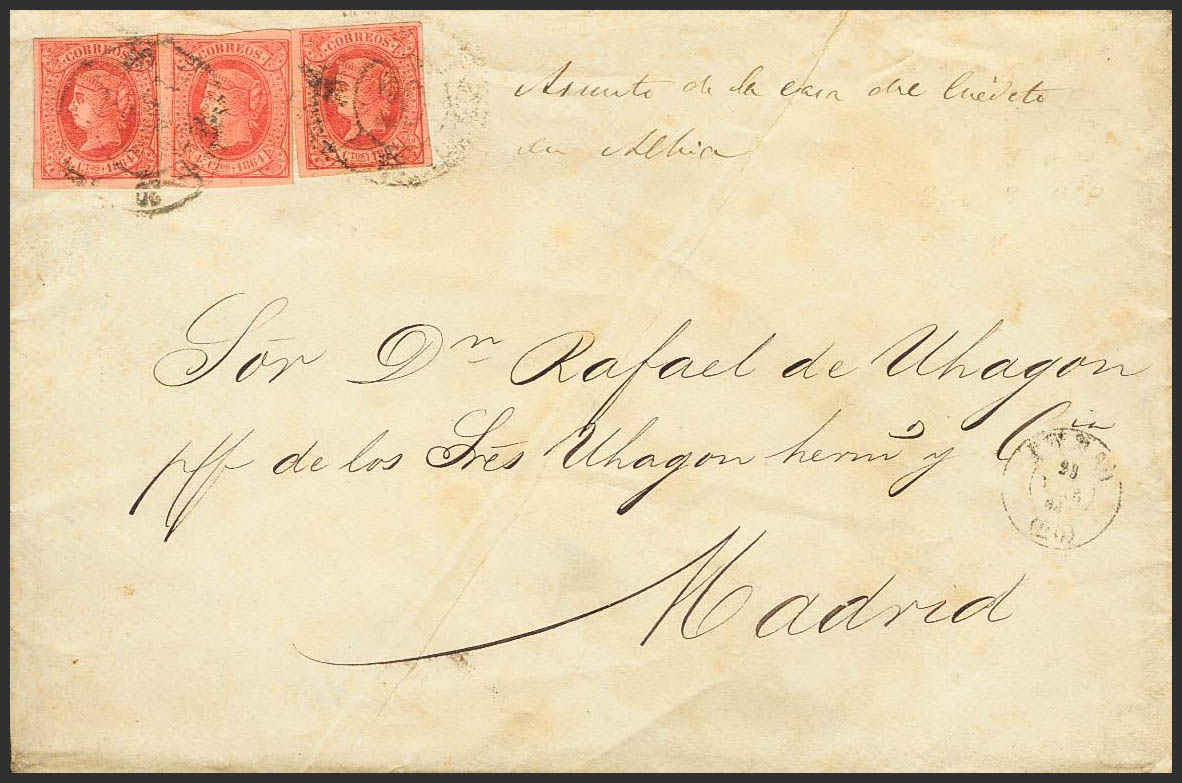 64(3). 1864. 4 red cuartos , three stamps. BILBAO to MADRID. Postmark R.CARRETA Nº20, triple size. MAGNIFICENT.