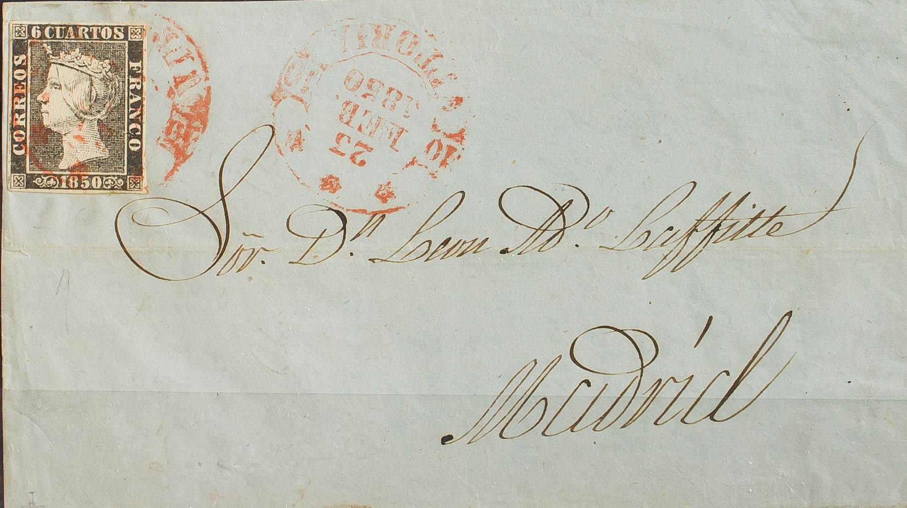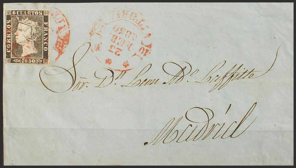 1. 1850. 6 cuartos black. Front from VITORIA to MADRID. Postmark *** / VITORIA. MAGNIFICENT.