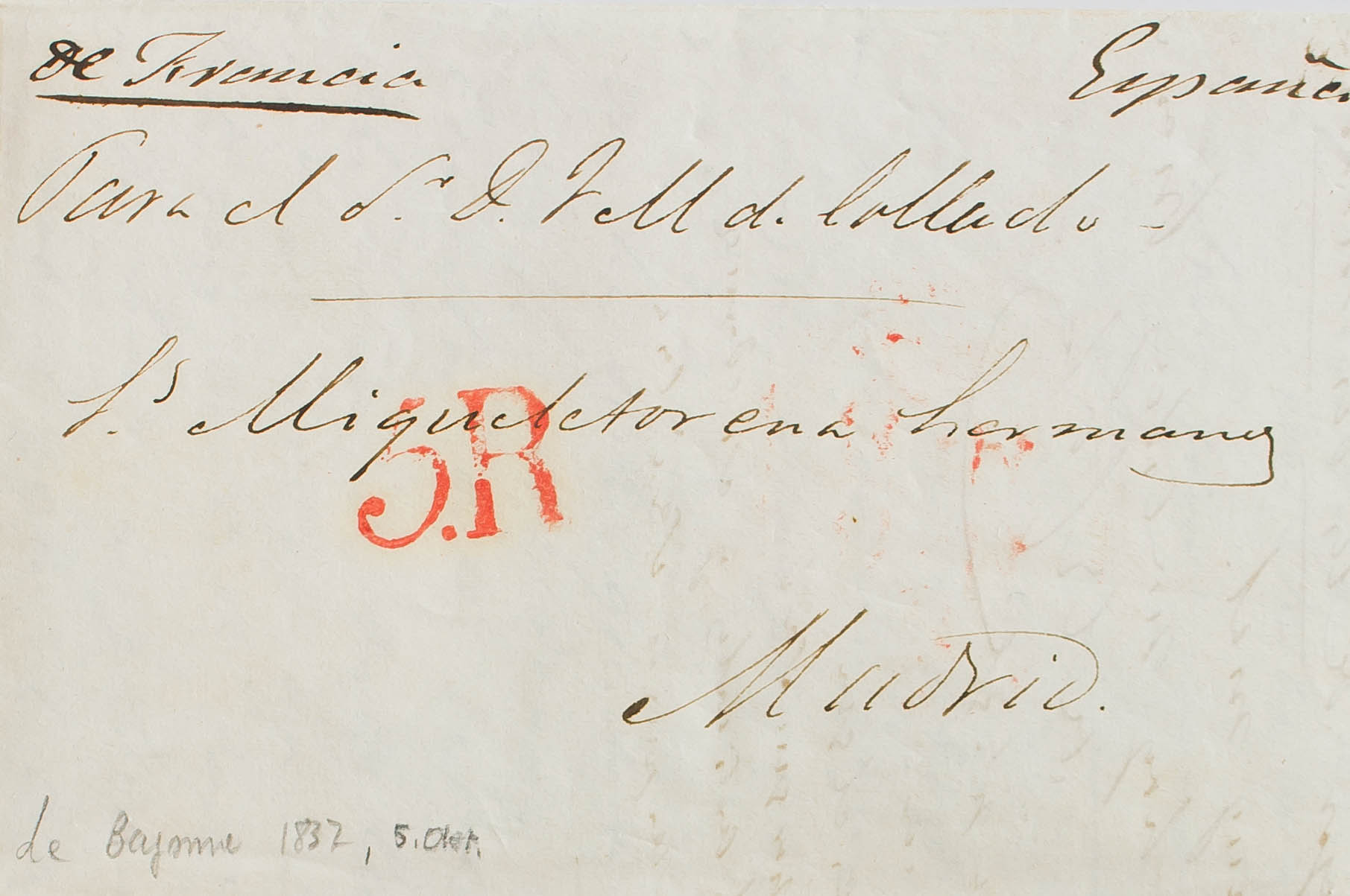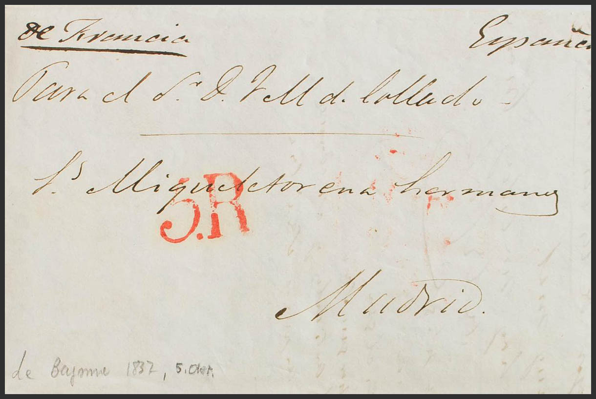 1837. BAYONNE (FRANCE) to MADRID. Manuscript "De Francia", probably applied at the Irún border crossing, and portage "5R" (reales). MAGNIFICENT.