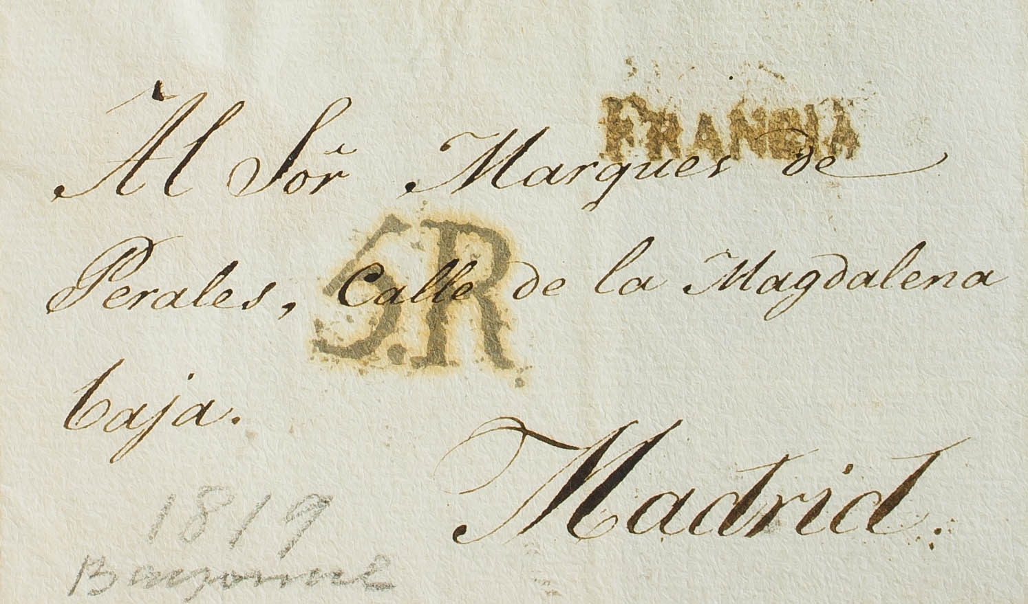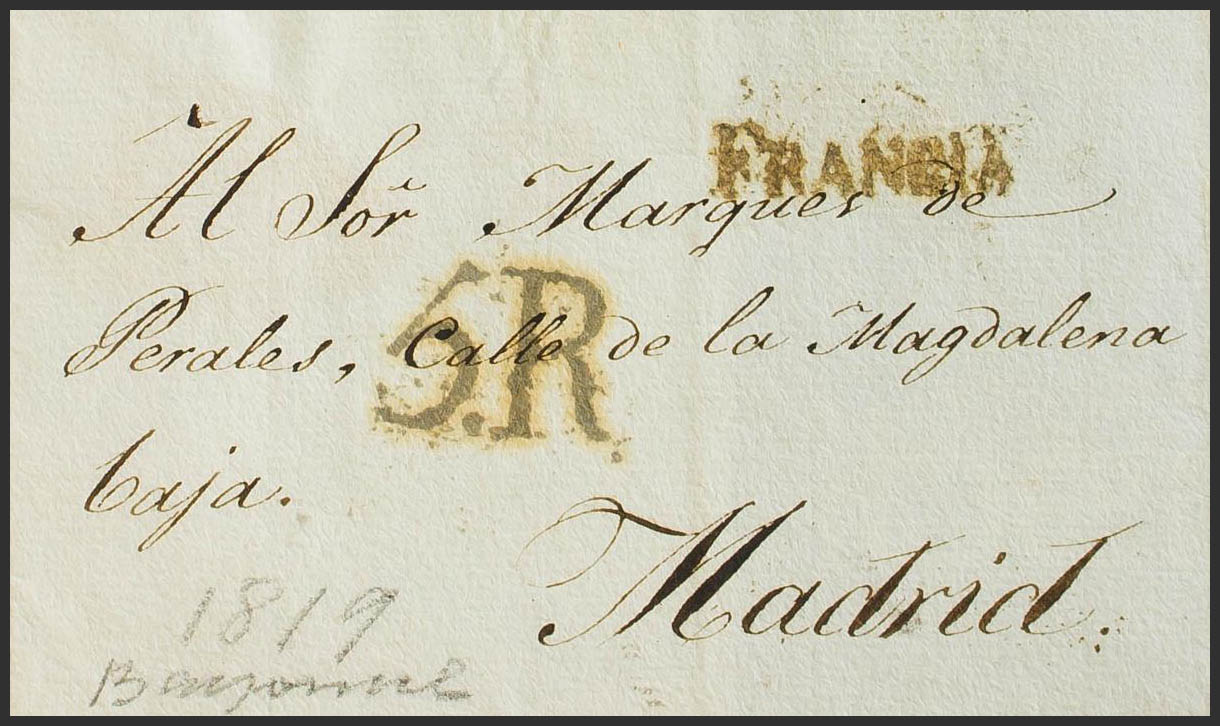 (1820ca). Front directed to MADRID. FRANCE mark, from Irún applied in transit to indicate the origin of the letter (PE22) 2004 edition. MAGNIFICENT.