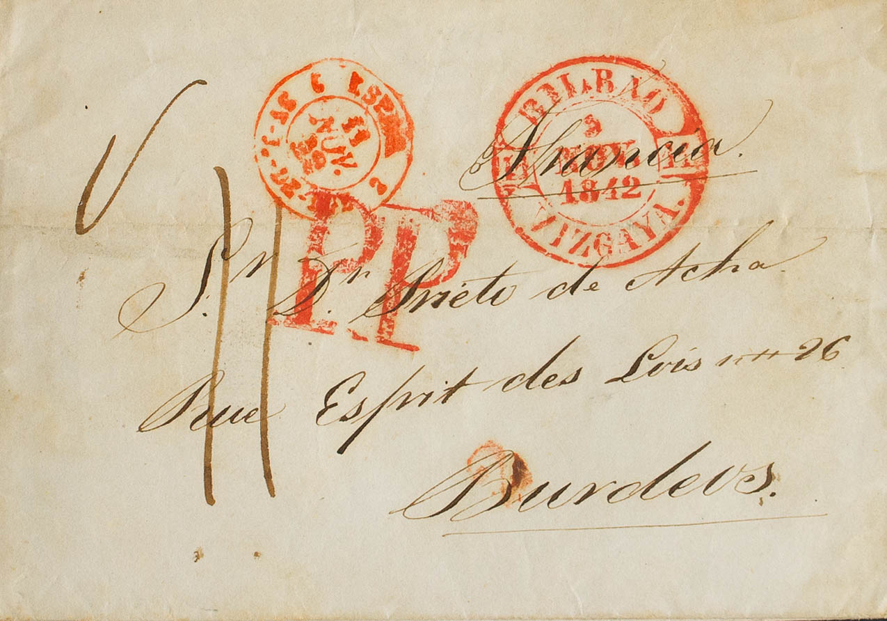 1842. BILBAO to BORDEAUX (FRANCE). Postage Paid "PP" mark applied in Bilbao (PE31) 2004 edition. MAGNIFICENT AND VERY RARE.