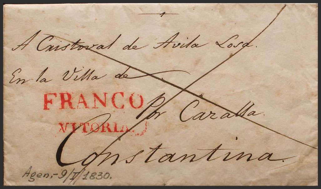 English 1797. AGEN (FRANCE) to CONSTANTINE, deposited in the Vitoria post office. Brand FRANCO / VITORIA (PE25) 2004 edition. MAGNIFICENT AND VERY RARE.