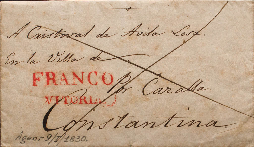 1797. AGEN (FRANCE) to CONSTANTINE, deposited in the Vitoria post office. Brand FRANCO / VITORIA (PE25) 2004 edition. MAGNIFICENT AND VERY RARE.