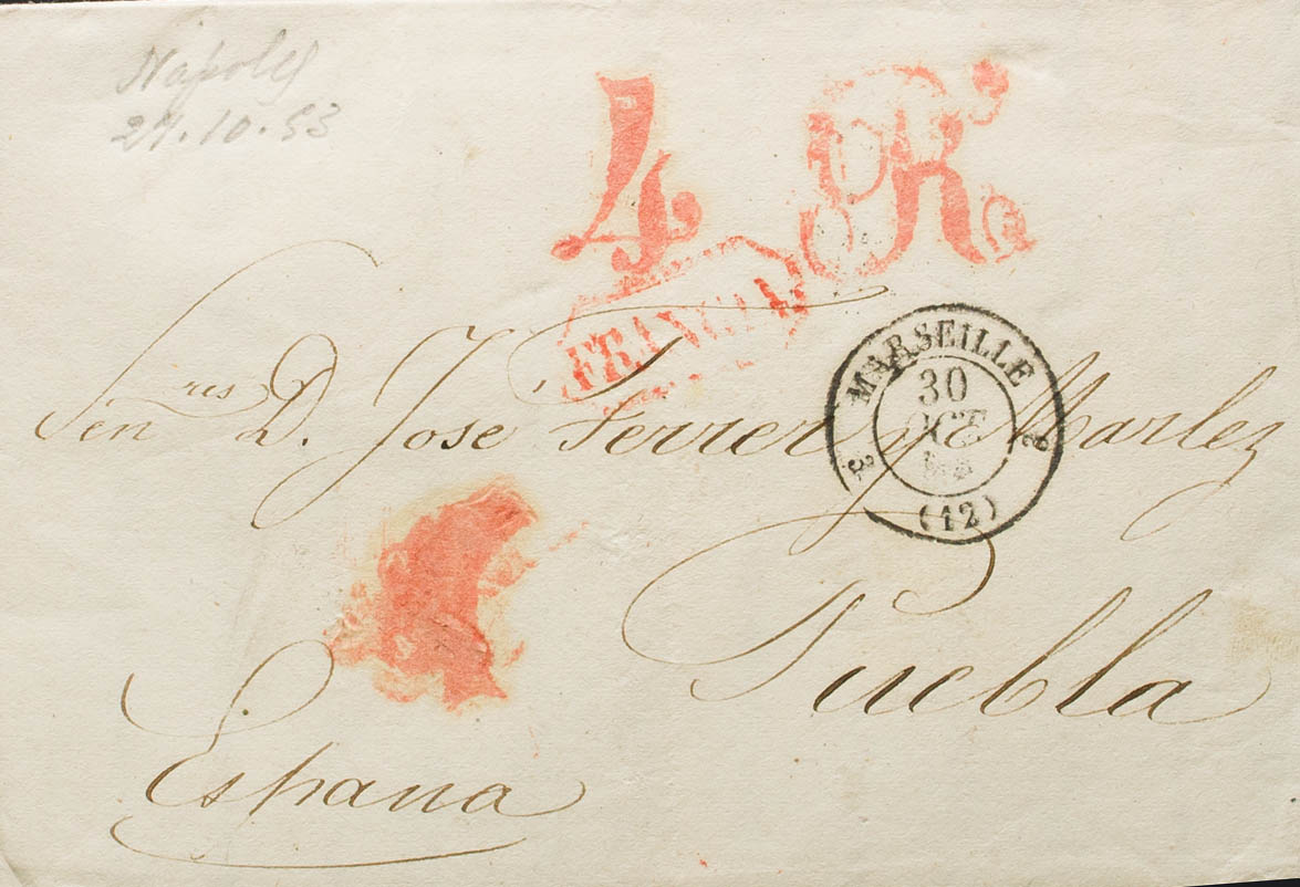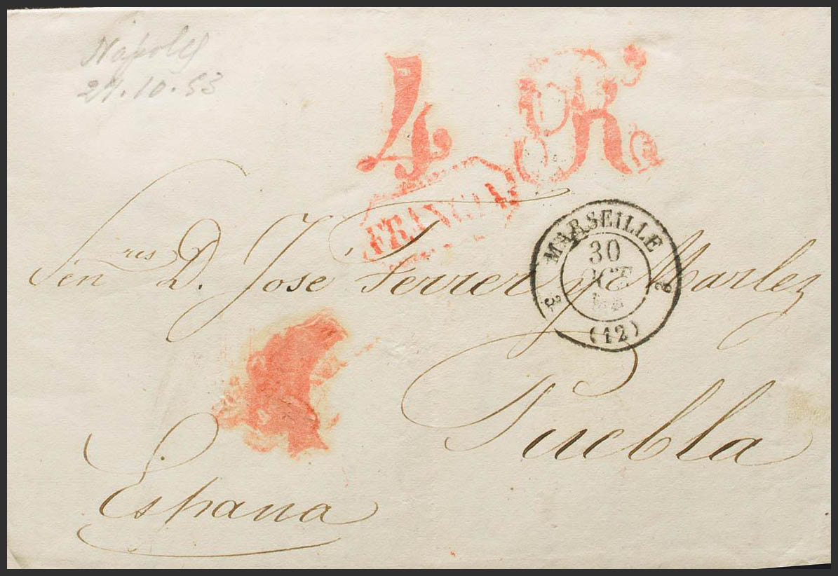 English 1853. NAPLES to PUEBLA. FRANCE mark, in red and applied in transit through Irún to indicate the origin (it was probably deposited in Marseille) (PE26) 2004 edition. MAGNIFICENT.