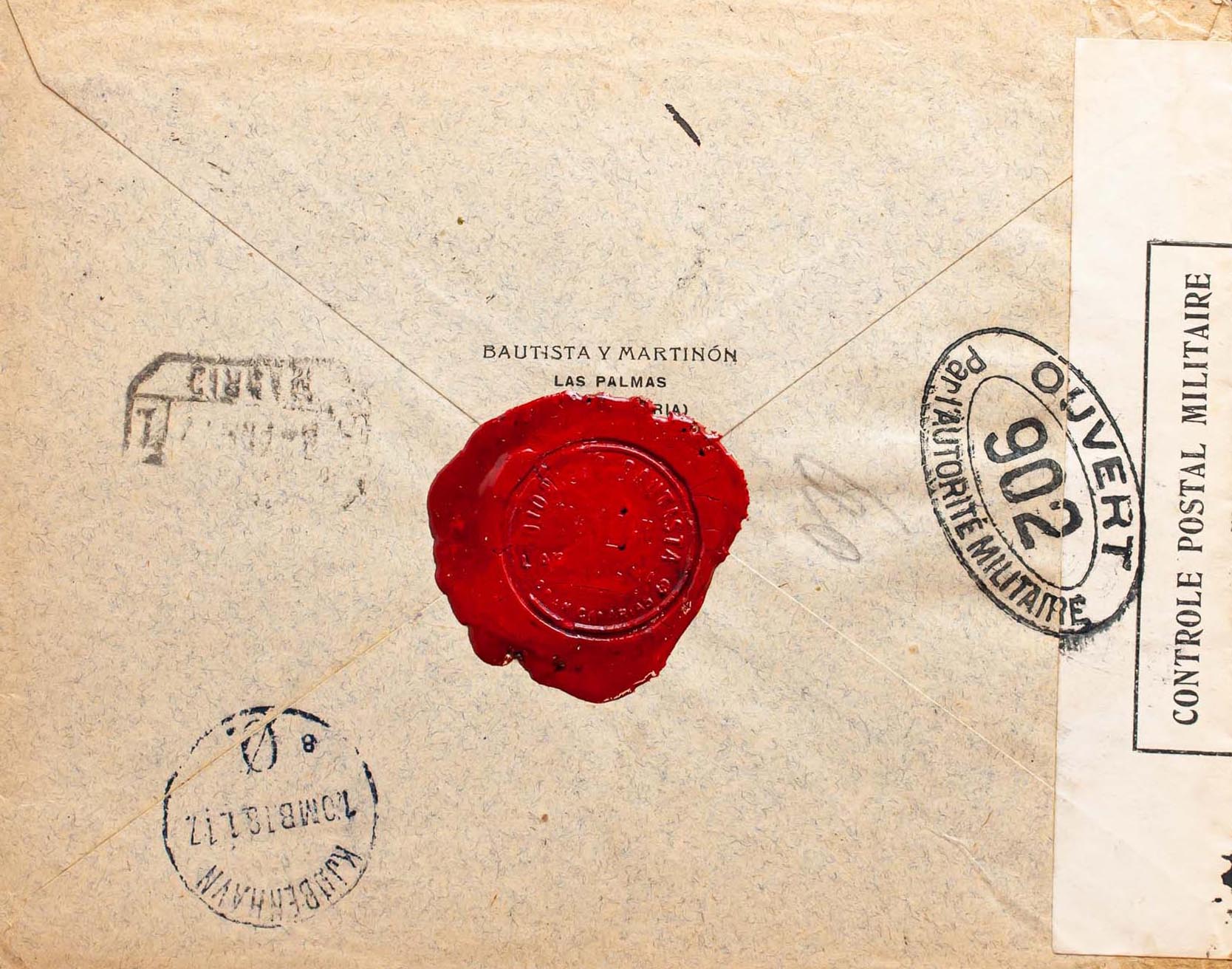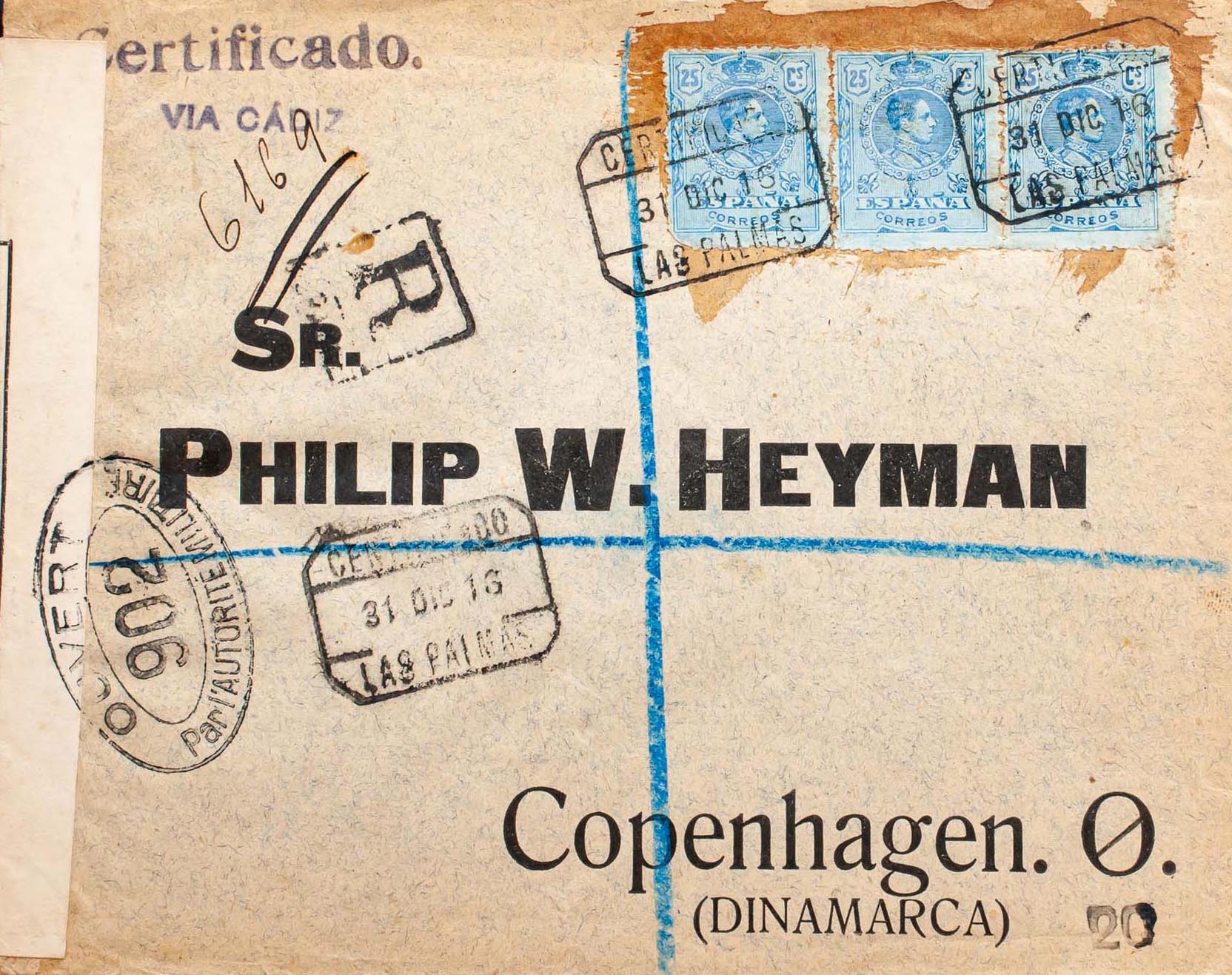 Canary Islands. Postal History. CERTIFICATE / LAS PALMAS, on the back of arrival. MAGNIFICENT.