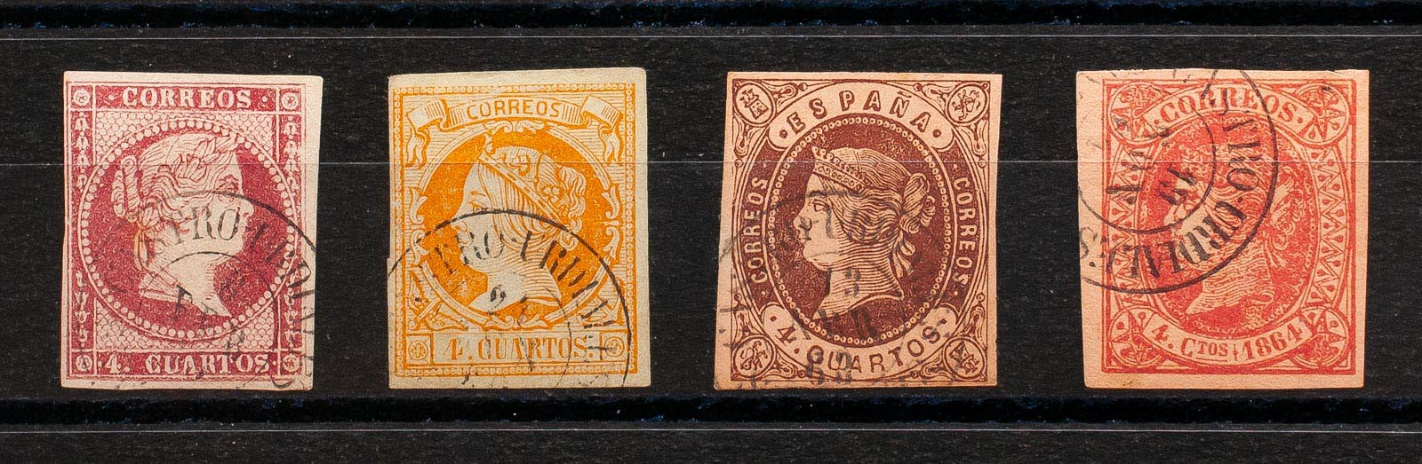 48, 52, 58, 64. (1855ca). Set of four 4- cuartos stamps red, yellow, brown and pink, unused with CASTRO URDIALES / SANTANDER postmark. MAGNIFICENT.