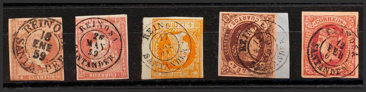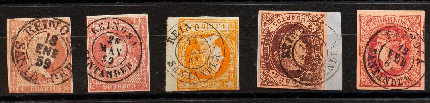 48(2), 52, 58, 64. (1855ca). Set of five 4- cuartos red, yellow, brown and pink stamps, unused with the REINOSA / SANTANDER postmark (including Type I on the 4- cuartos red). MAGNIFICENT.