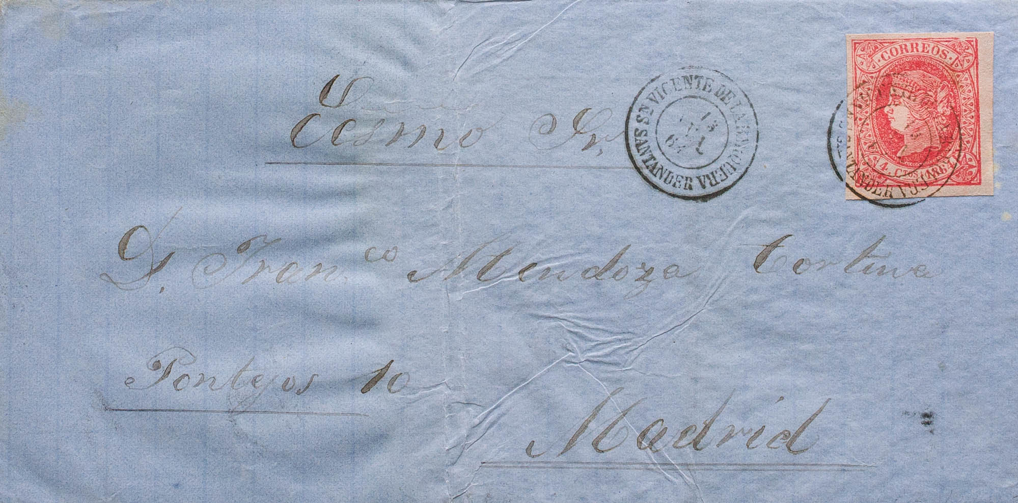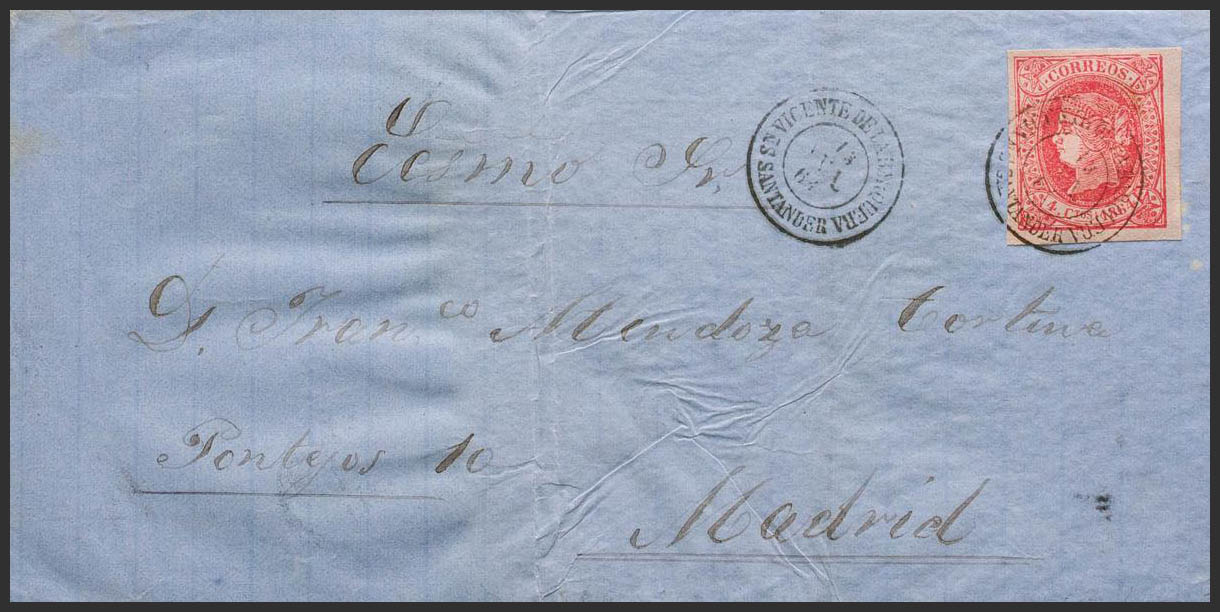 64. 1864. 4 red cuarto . SAN VICENTE DE LA BARQUERA to MADRID. Postmark SAN VICENTE DE LA BARQUERA / SANTANDER. MAGNIFICENT AND RARE.