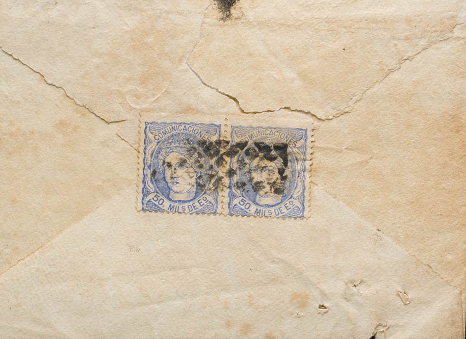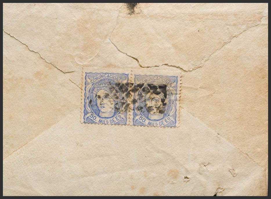 107(2). (1870ca). 50 mils overseas, pair (stamped on back as closure). ENTRAMBASAGUAS (CANTABRIA) to BURGOS. RECTANGLE OF CROSSED LINES postmark and on the front mark JUZGADO DE 1ª INSTANCIA DEL PARTIDO DE / ENTRAMBASAGUAS, in blue and hardly visible date stamp. MAGNIFICENT AND EXTREMELY RARE, WE ARE BEFORE ONE OF THE TWO KNOWN LETTERS THAT LOCATE THIS POSTMARK IN THE TOWN OF ENTRAMBASAGUAS.
