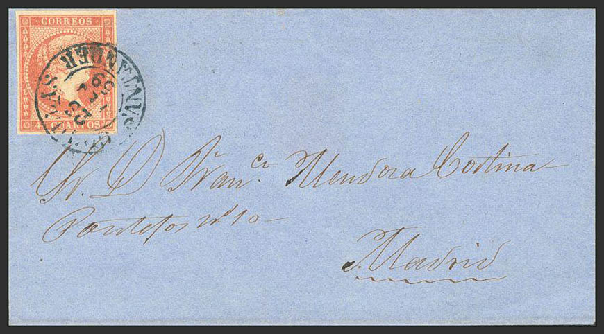 48. 1856. 4 red cuartos . COMILLAS to MADRID. Postmark COMILLAS / SANTANDER (Type I), in blue. MAGNIFICENT.