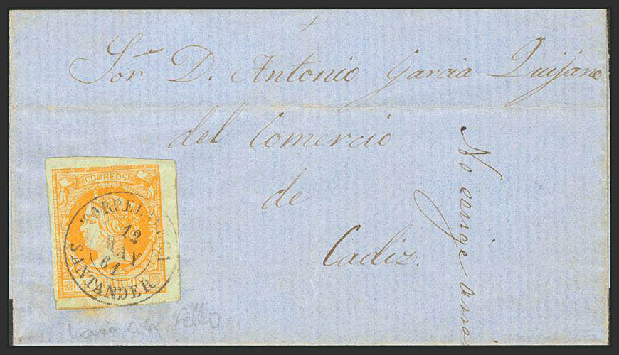 52. 1861. 4 cuartos yellow. TORRELAVEGA to AGUILAR. Postmark TORRELAVEGA / SANTANDER. MAGNIFICENT.