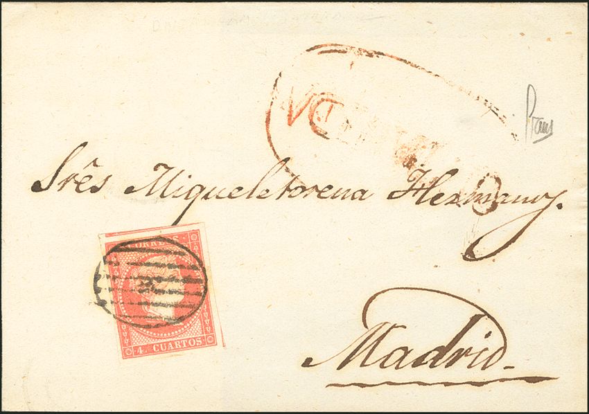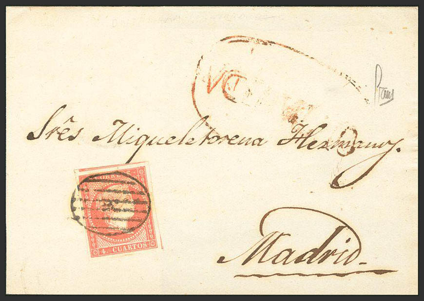 48. 1857. 4 red cuartos . ONTANEDA to MADRID. Postmark GRILL and mark ONTANEDA, in red. WEIRD.