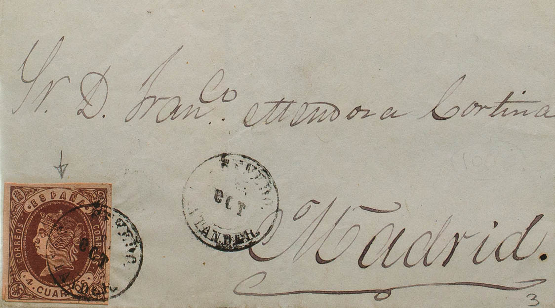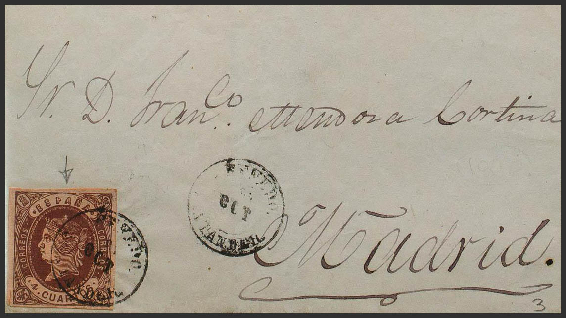 58. 1863. 4- cuartos chestnut. RENEDO to MADRID. Postmark RENEDO / SANTANDER. MAGNIFICENT AND RARE.