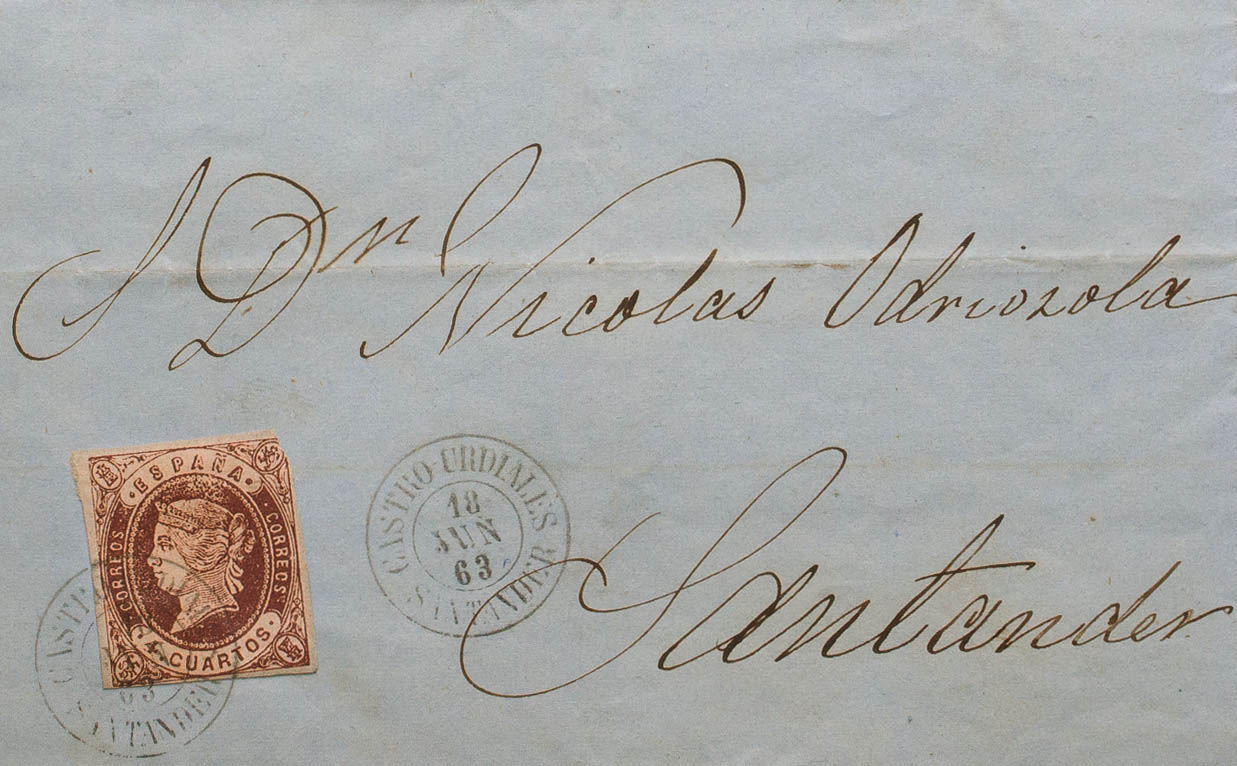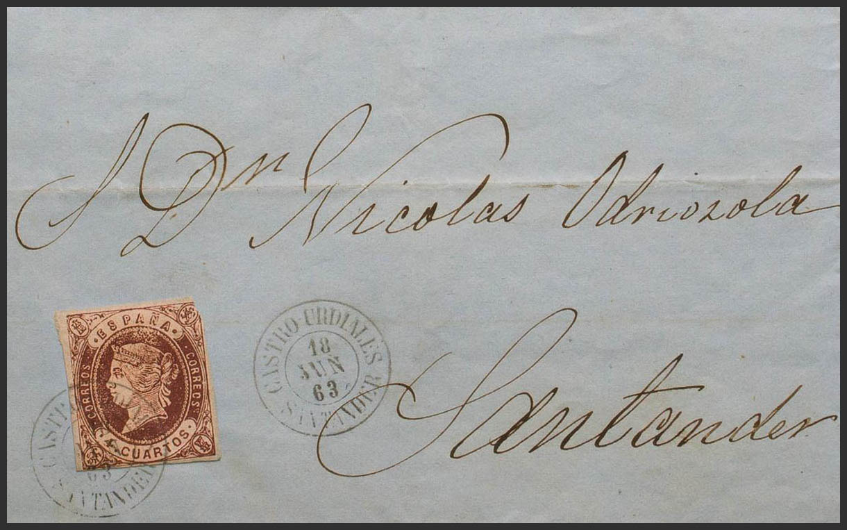 58. 1863. 4- cuartos chestnut. CASTRO-URDIALES to SANTANDER. Postmark CASTRO-URDIALES / SANTANDER. MAGNIFICENT.