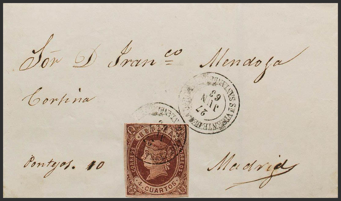 58. 1863. 4- cuartos chestnut. SAN VICENTE DE LA BARQUERA to MADRID. Postmark SN. VICENTE DE LA BARQUERA / SANTANDER. MAGNIFICENT AND VERY RARE.