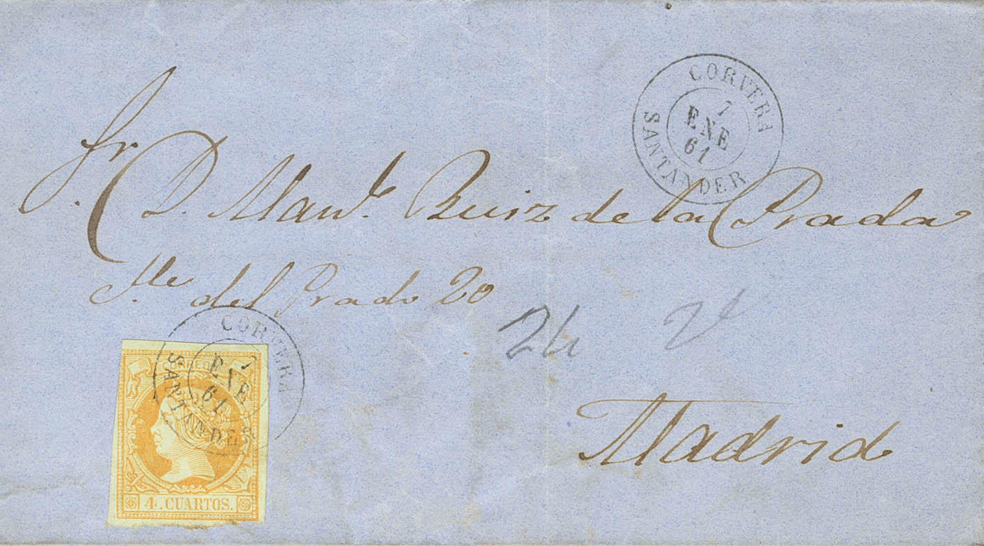 52. 1861. 4 orange cuartos . CORVERA to MADRID. CORVERA / SANTANDER postmark. MAGNIFICENT AND RARE.