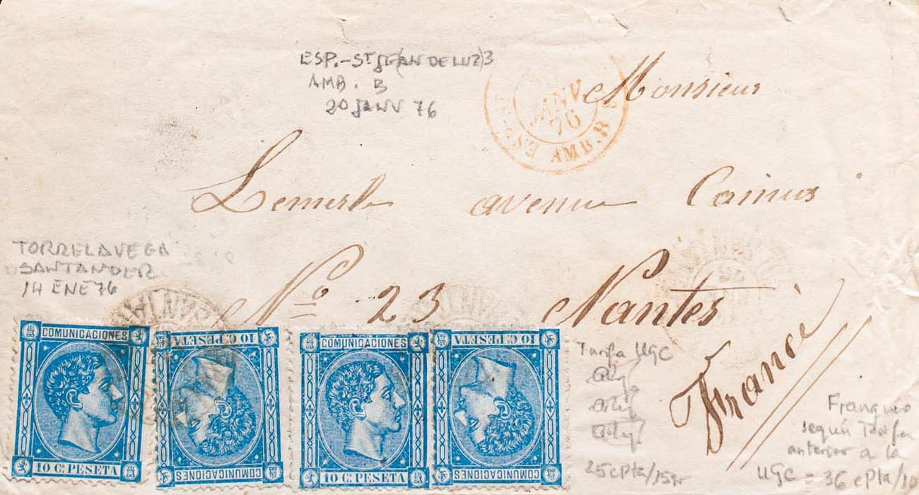 164(4). 1876. 10 cts blue, four stamps. TORRELAVEGA to NANTES (FRANCE). Postmark TORRELAVEGA / SANTANDER. MAGNIFICENT AND UNUSUAL COMBINATION OF POSTAGE TO COMPLETE THE RATE OF 40 CTS TO FRANCE.