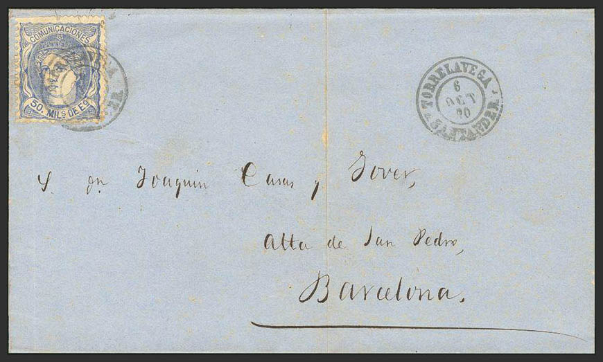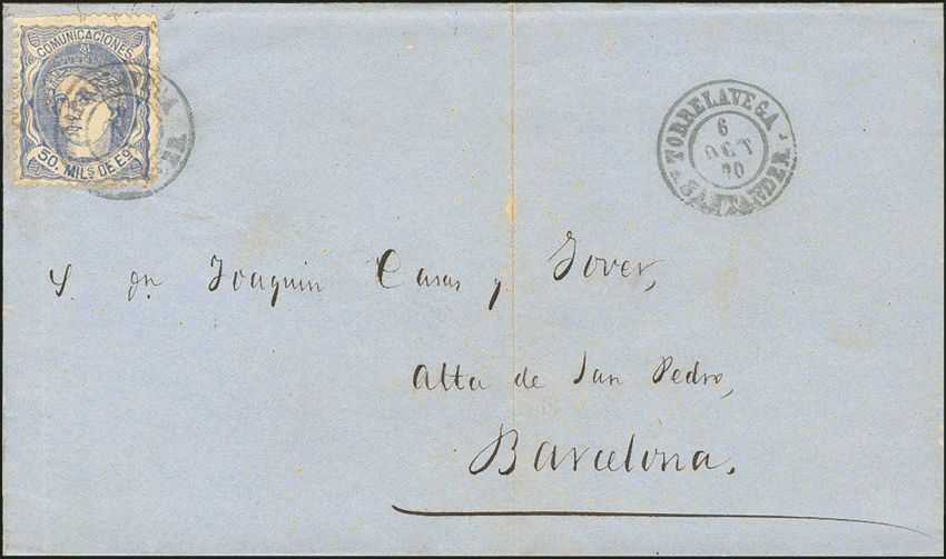 107. 1870. 50 thousand blue. TORRELAVEGA to BARCELONA. Postmark TORRELAVEGA / SANTANDER, blued. MAGNIFICENT.