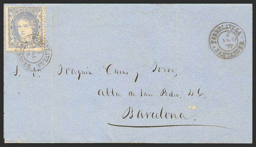 107. 1870. 50 thousand blue. TORRELAVEGA to BARCELONA. Postmark TORRELAVEGA / SANTANDER. MAGNIFICENT.