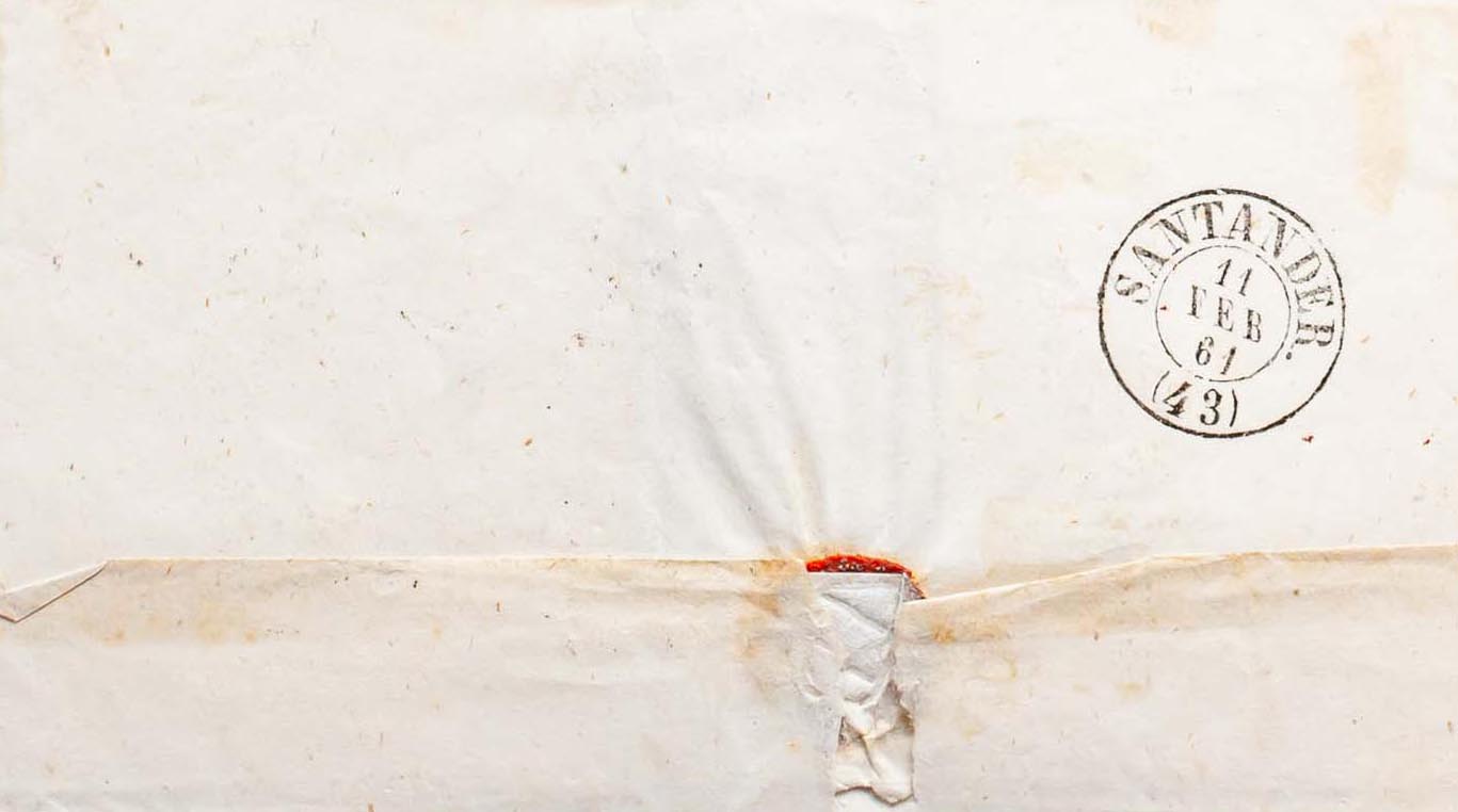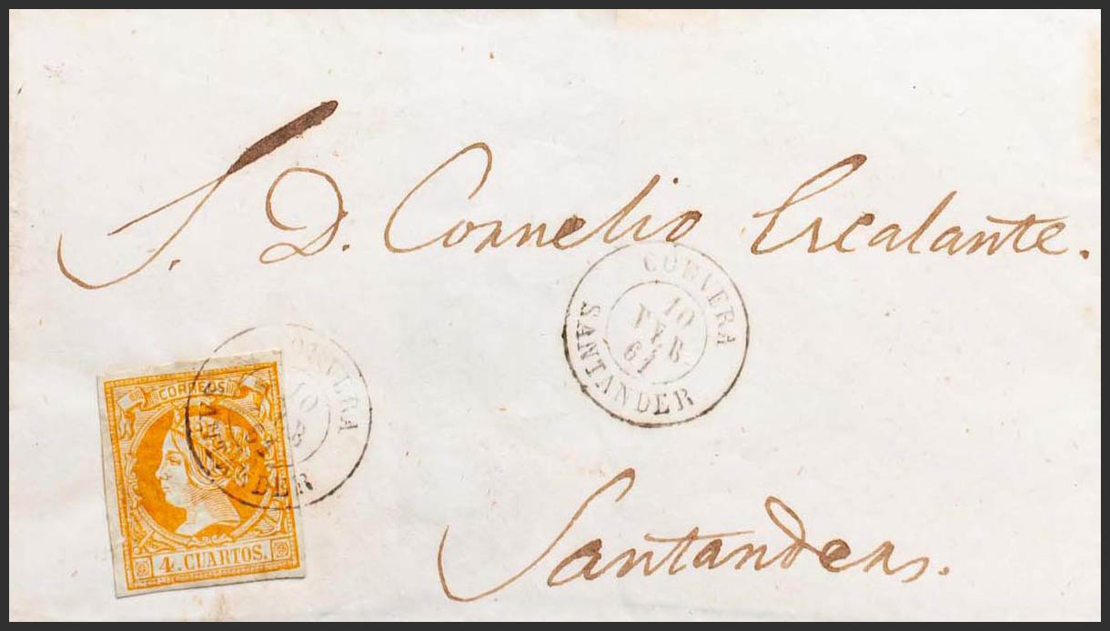 52. 1861. 4 orange cuartos . CORVERA to SANTANDER. CORVERA / SANTANDER postmark. MAGNIFICENT AND RARE.