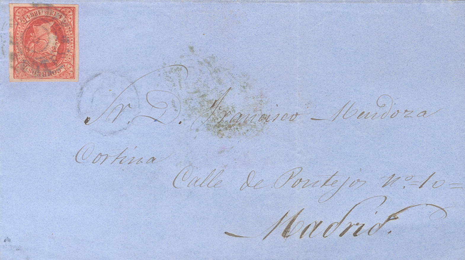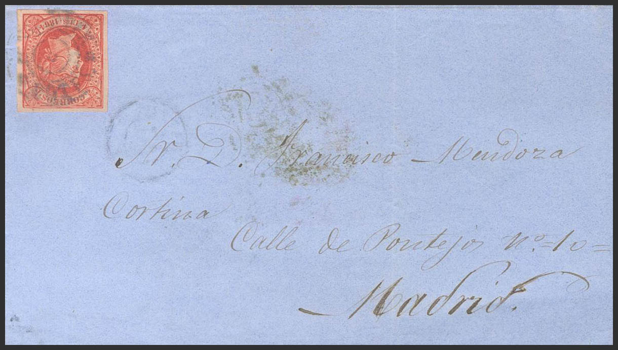 64. 1864. 4 cuartos red. POTS to MADRID. Special circular postmark SANTANDER / POTES, in blue. MAGNIFICENT AND RARE, ESPECIALLY IN THIS LATE ISSUE.
