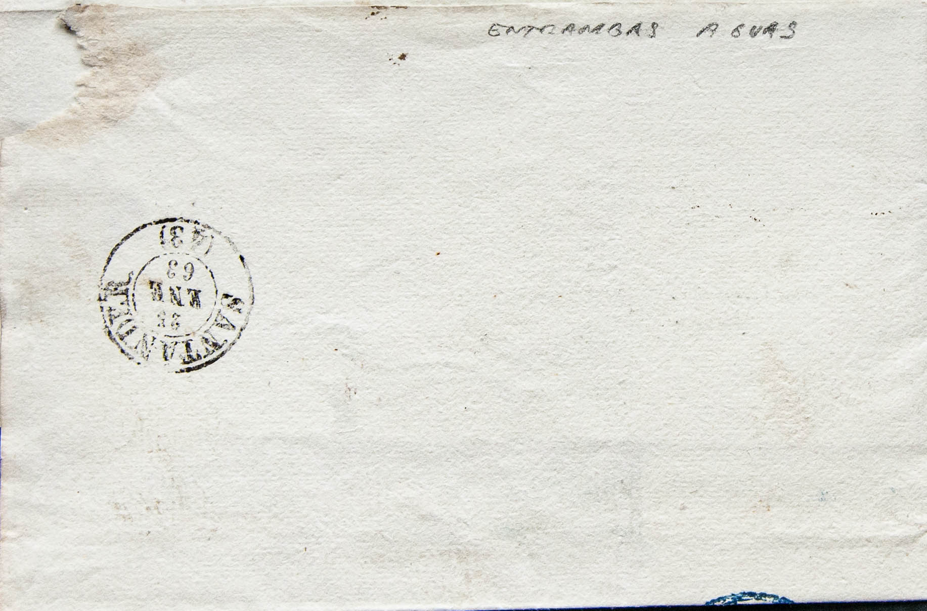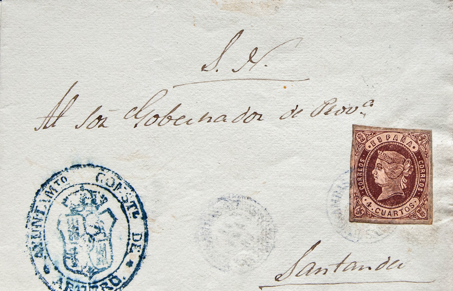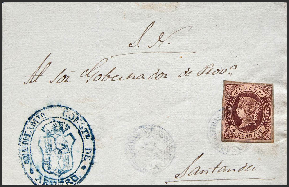 58. 1863. 4 cuartos chestnut. ARMERO (CANTABRIA) to SANTANDER. ENTRAMBAS-AGUAS / SANTANDER postmark, in blue. MAGNIFICENT AND RARE.