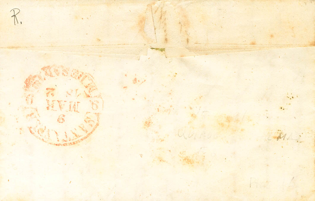 |ABOUT| 12. 1852. 6 pink quarters. COMILLAS to SANTANDER. On the front Baeza COMILLAS / M. DE SANTR, in red. MAGNIFICENT AND RARE.