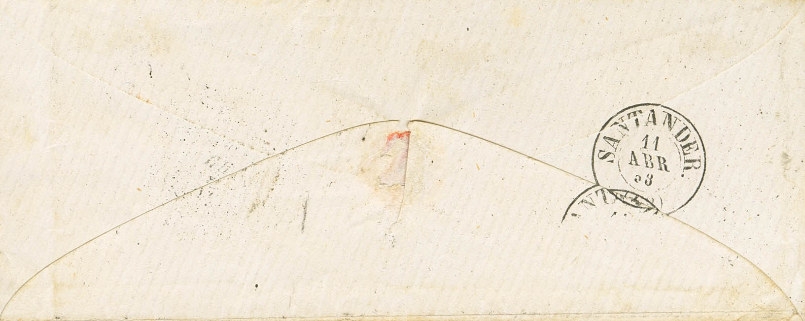 |ABOUT| 48. 1858. 4 red quarters. CASTRO URDIALES (CANTABRIA) to SANTANDER. On the front pre-philatelic mark CASTRO-URDIALES / VIZCAYA, in red. MAGNIFICENT AND RARE.