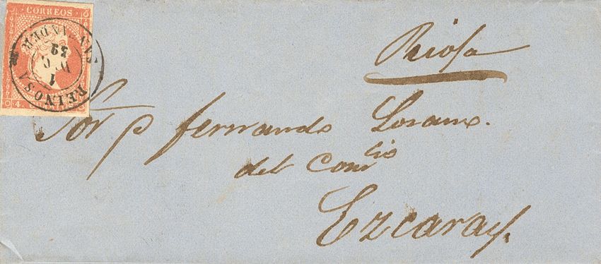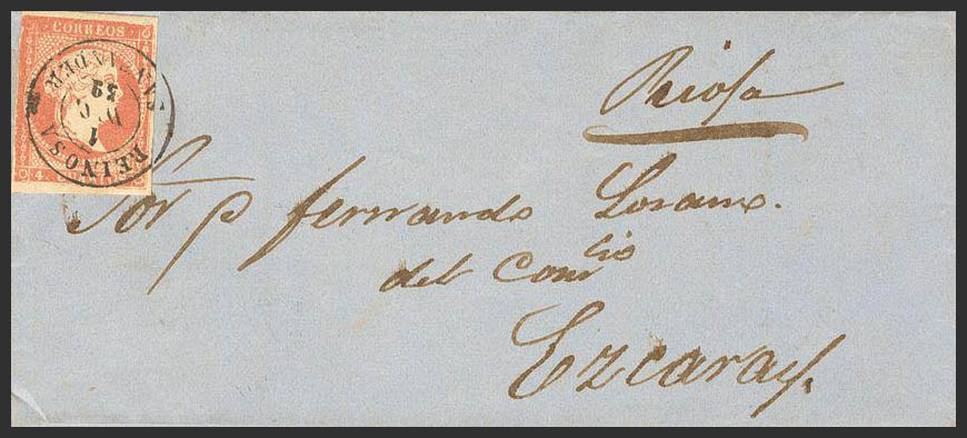 48. 1859. 4 red cuartos . REINOSA to EZCARAY. REINOSA / SANTANDER postmark. MAGNIFICENT.