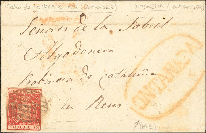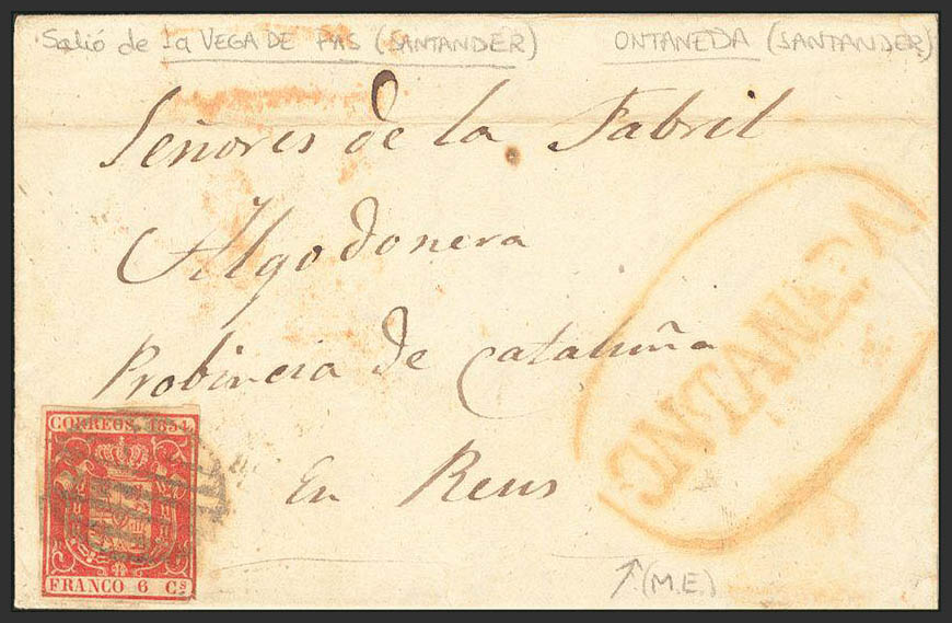 24. 1854. 6 carmine cuartos . VEGA FROM PAS to REUS. On the front pre-philatelic mark ONTANEDA. MAGNIFICENT.