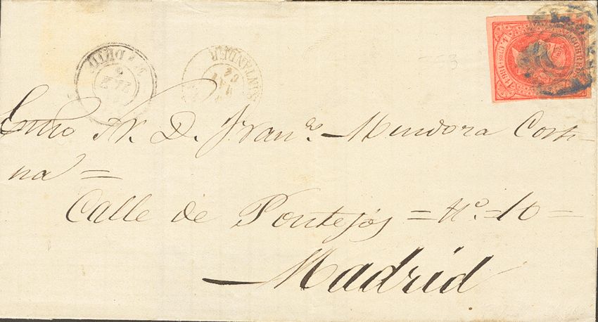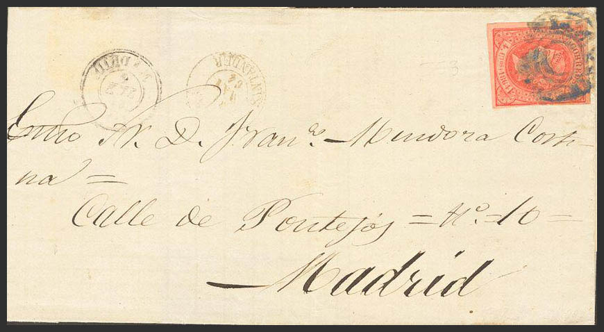 64. 1864. 4 salmon cuartos . POTES to MADRID. Pre-philatelic postmark SANTANDER / POTES. MAGNIFICENT AND RARE.