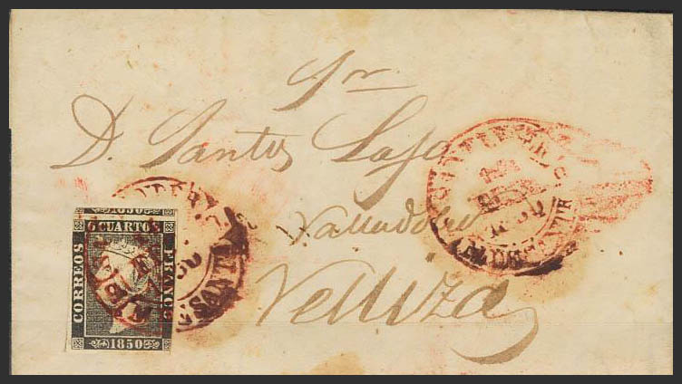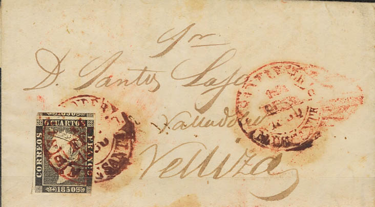 1. 1850. 6 cuartos black. SANTANDER to VELLIZA. Postmark SANTANDER / M. DE SANTª. MAGNIFICENT.