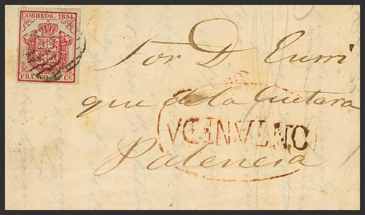 33. 1855. 4 red cuartos . ALCEDA-TORANZO to PALENCIA. On the front pre-philatelic mark ONTANEDA. MAGNIFICENT AND RARE.