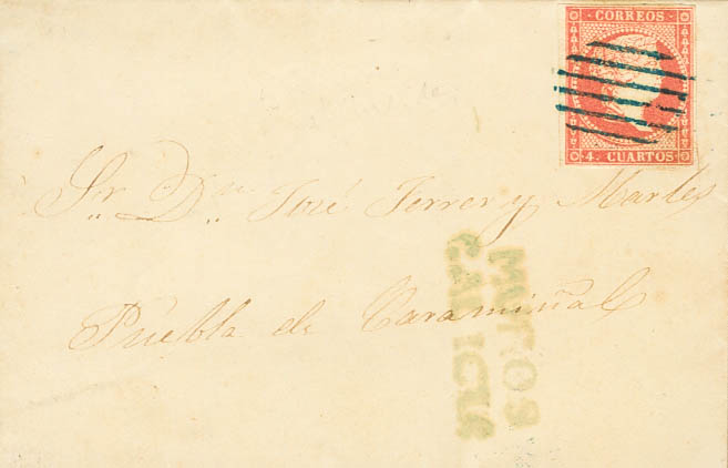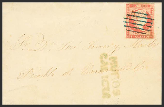 48. 1858. 4 red cuartos . WALLS to PUEBLA. Postmark PARRILLA, in blue and on the front pre-philatelic transit mark MUROS / GALICA, in green. MAGNIFICENT AND RARE.