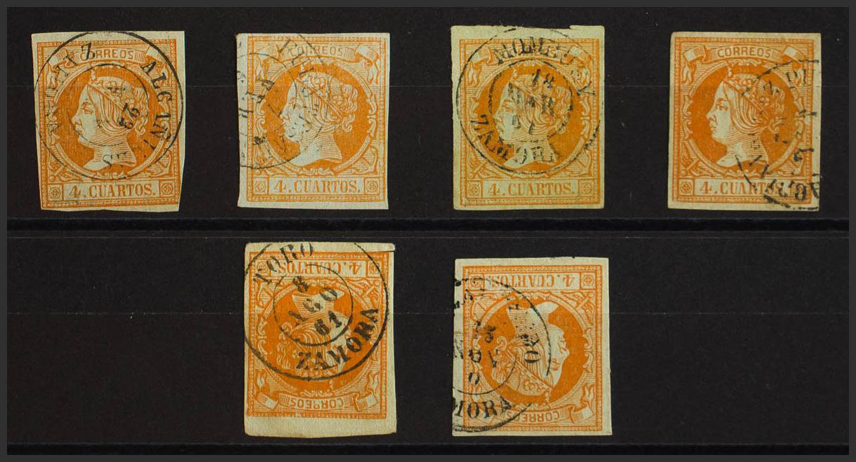 52(6). 1860. Set of six unused yellow 4- cuartos stamps with the dates of the province of Zamora: ALCAÑICES, FUENTESAUCO, MOMBUEY, PUEBLA DE SANABRIA, TORO and VILLALPANDO. MAGNIFICENT.