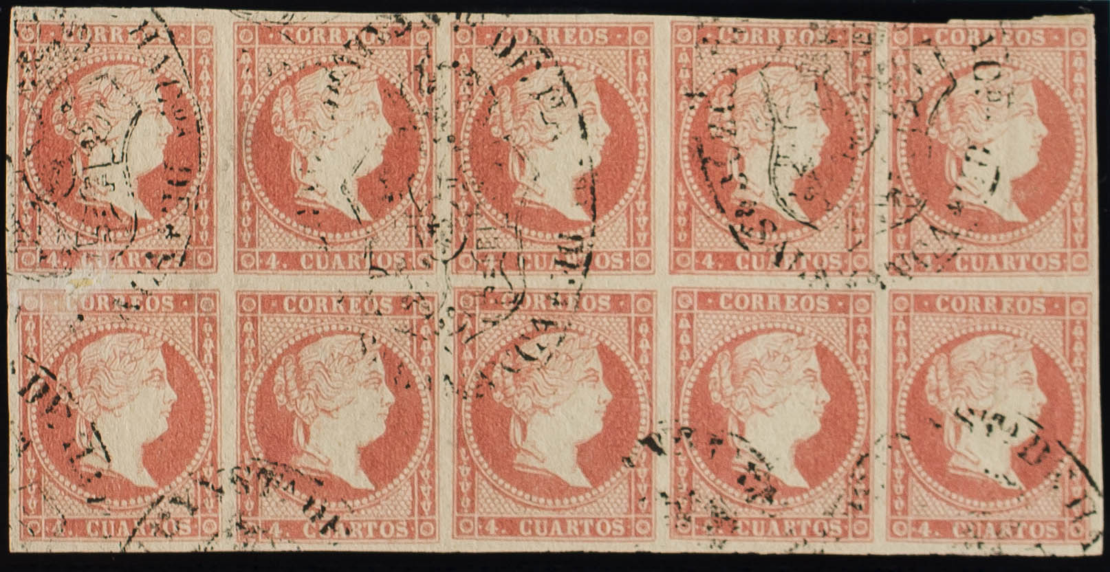 48(10). 1855. 4 red cuartos , block of ten. Postmark COURT OF 1ST YNST OF HACDª DE / SALAMANCA. MAGNIFICENT.