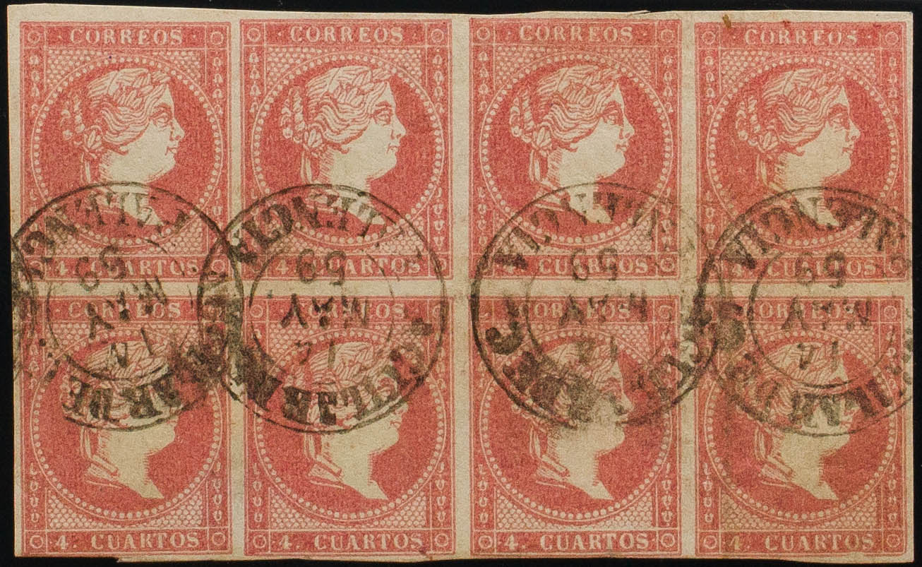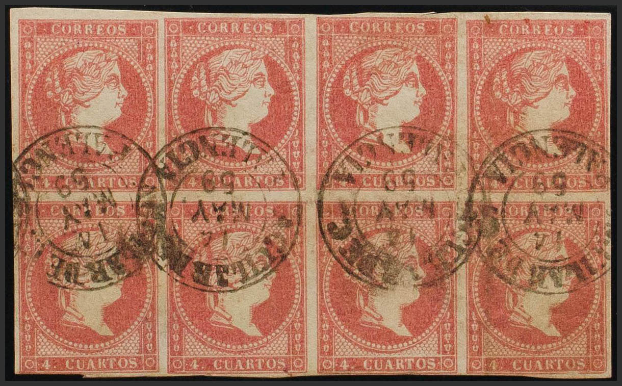 English 48(8). 1856. 4 red cuartos , block of eight. Postmark AGUILAR DE C. / PALENCIA (Type I). MAGNIFICENT.