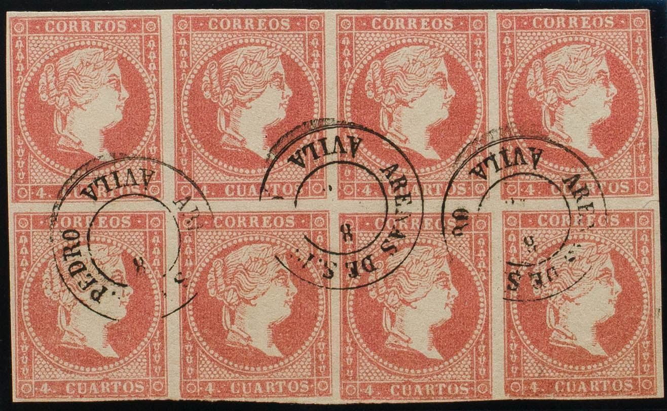 48(8). 1856. 4 red cuartos , block of eight. Postmark ARENAS DE S. PEDRO / AVILA. MAGNIFICENT AND RARE.