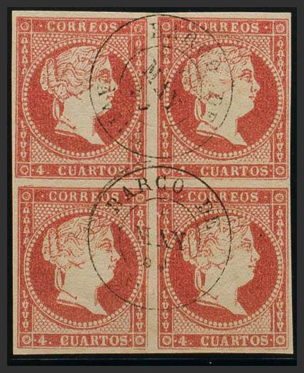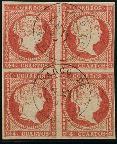 48(4). 1855. 4 red cuartos , block of four. Postmark SHIP FROM / AVILA. MAGNIFICENT AND VERY RARE.