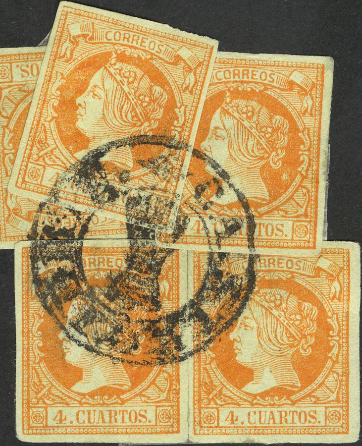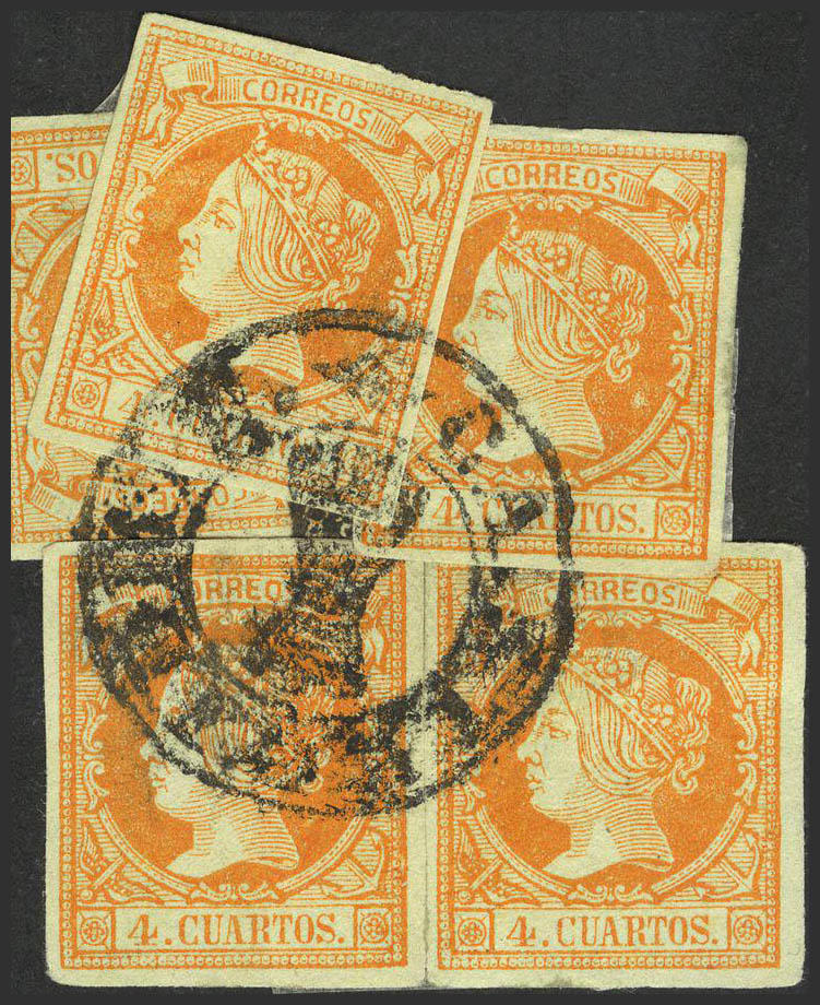 52(5). 1860. 4 yellow cuartos , (five stamps reconstructing the brand). PREFILATELIC postmark CASTROJERIZ. MAGNIFICENT.