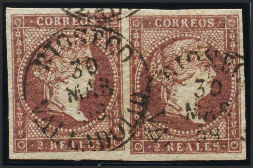 English 46(2). 1855. 2 reales violet, pair. Postmark RIOSECO / VALLADOLID (Type I). MAGNIFICENT AND RARE.