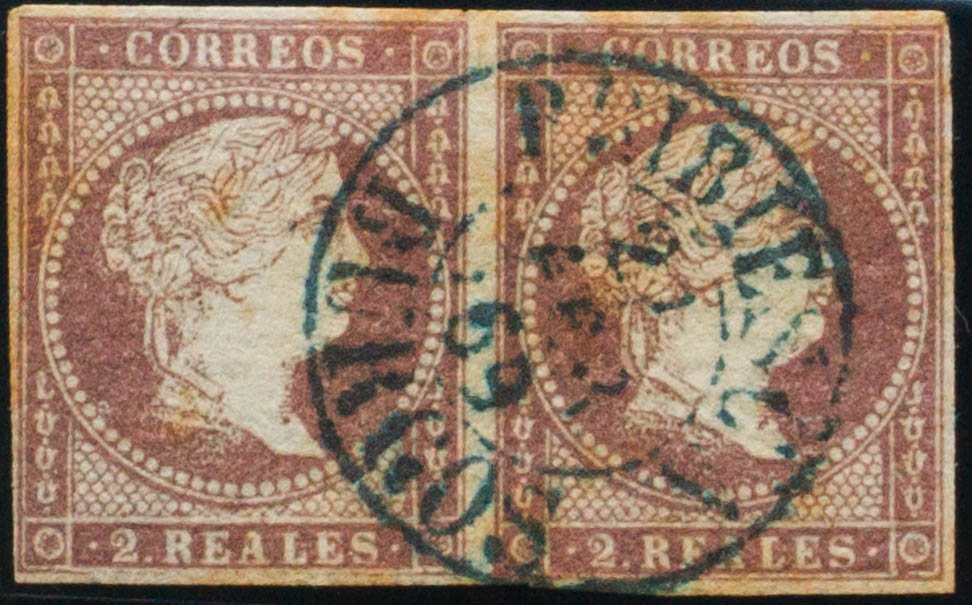 46(2). 1855. 2 reales violet, pair (time stains). Postmark BRIBIESCA / BURGOS (Type I), in blue. MAGNIFICENT AND SPECTACULAR.