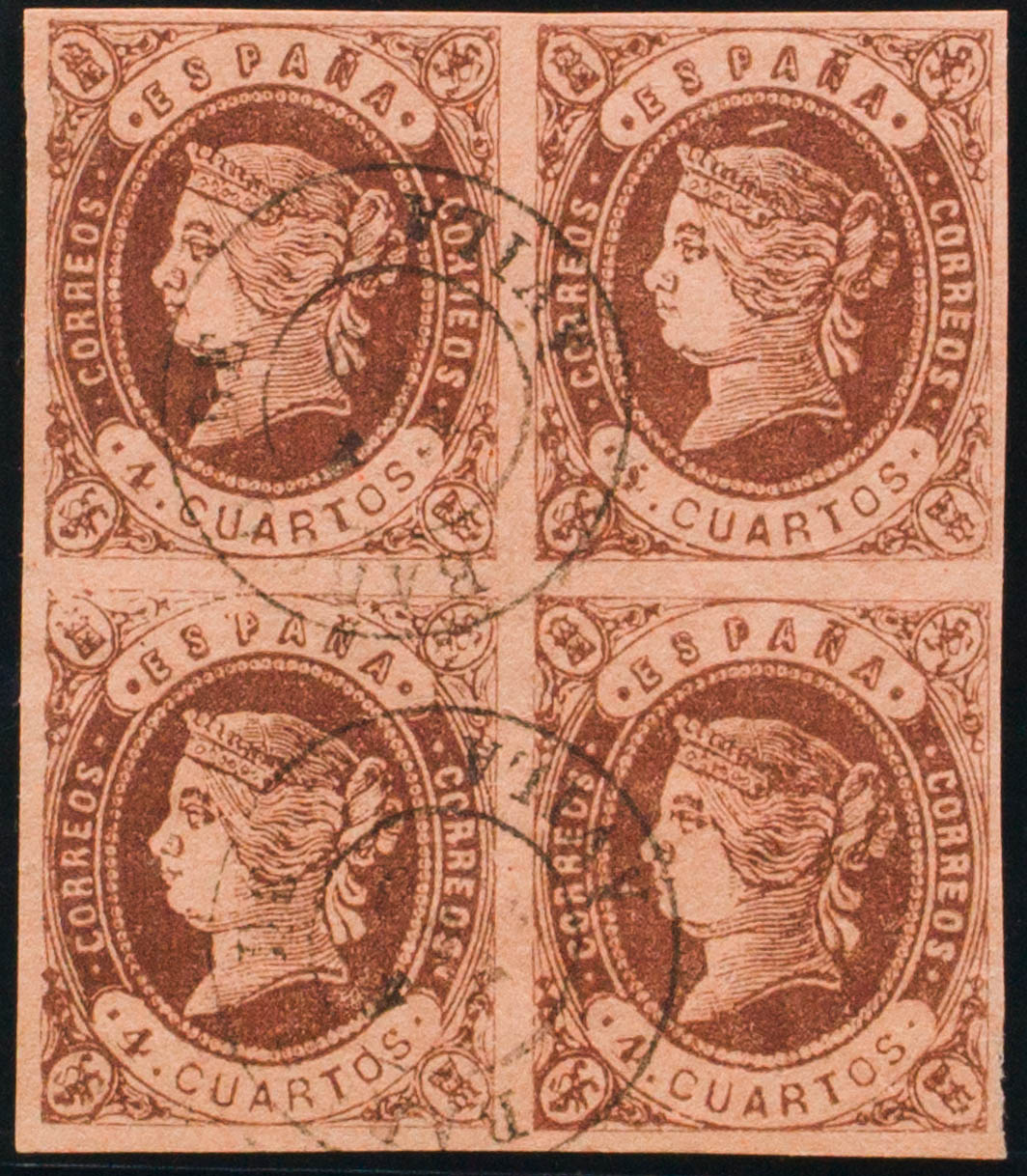English 58(4). 1862. 4 chestnut cuartos , block of four. Postmark SHIP FROM / AVILA. MAGNIFICENT AND RARE.