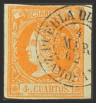 52. 1860. 4 cuartos yellow. Postmark PUEBLA DE SANABRIA / ZAMORA.