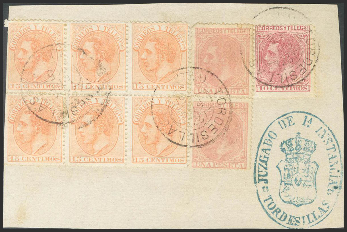 △ 202, 207(2), 210(6). 1882. 10 cts pink, 15 cts orange (two stamps margins without teeth), block of six and 1 pts, pair, on fragment of Judicial Escrow. Postmark TORDESILLAS / VALLADOLID. MAGNIFICENT.