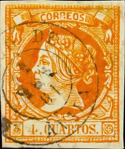 52. 1860. 4 cuartos yellow. Postmark BARCO DE / AVILA. MAGNIFICENT .