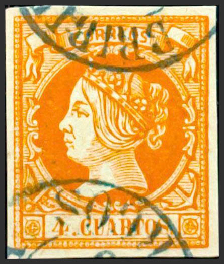52. 1860. 4 cuartos yellow. BRIBIESCA / BURGOS postmark (Type I), in blue. MAGNIFICENT.