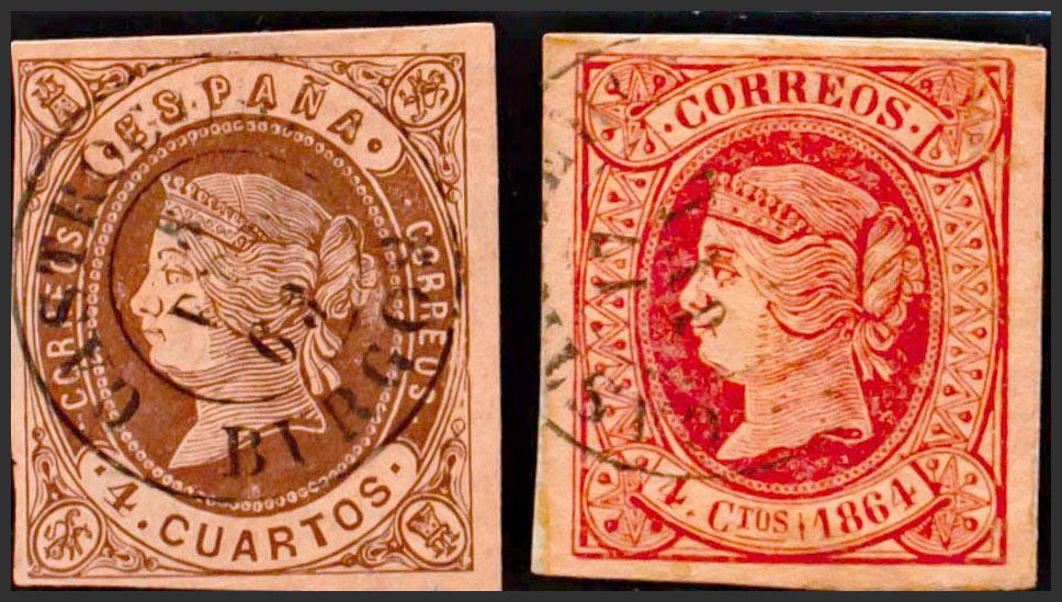 58, 64. (1862ca). Set of two stamps of 4 cuartos brown and 4 cuartos pink, unused with CASTROGERIZ / BURGOS postmark. MAGNIFICENT.