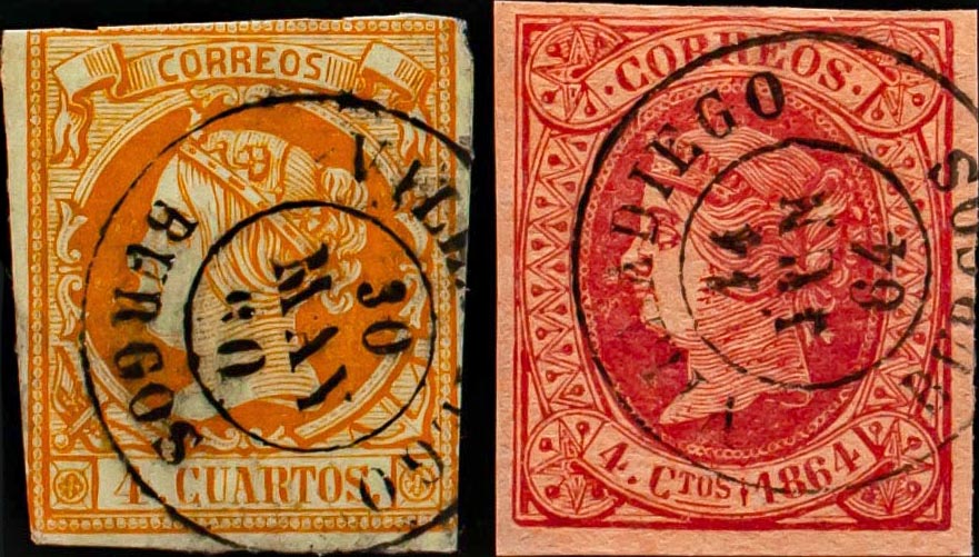 52, 64. (1860ca). Set of two stamps of 4 cuartos yellow and 4 cuartos pink, unused with VILLADIEGO / BURGOS postmark. MAGNIFICENT AND RARE.